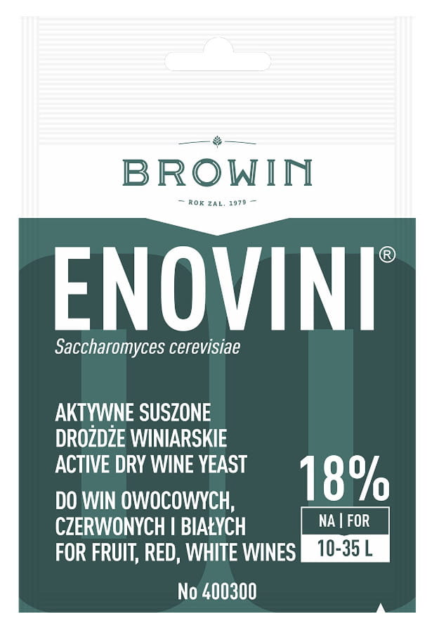 Drożdże aktywne ENOVINI to doskonała mieszanka dwóch szczepów drożdży winiarskich, do win owocowych, czerwonych i białych, nadająca niepowtarzalny bukiet. Tolerancja na alkohol do ok 18 %. .