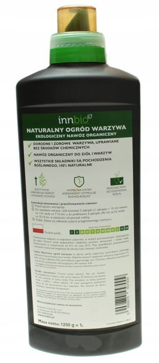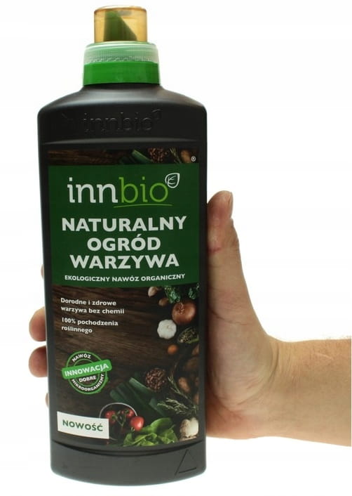 Innbio nawóz ekologiczny warzywa 1lNaturalny nawóz do warzyw i ziół Innbio 1l Obfite plony i to bez użycia chemii! Teraz to bardzo proste. Wystarczy wlać zawartość do konewki, nalać wodę i podlać, a siła natury zacznie działać. Nawóz Innbio jest zupełnie naturalnym nawozem pochodzenia roślinnego. Idealnie wpisuje się w ekologiczną uprawę ziół i warzyw. Możesz go stosować bez obawy o sztuczne składniki. Ten nawóz jest zupełnie bezpieczny dla Twoich roślin. Zalety nawozu naturalnego do warzyw