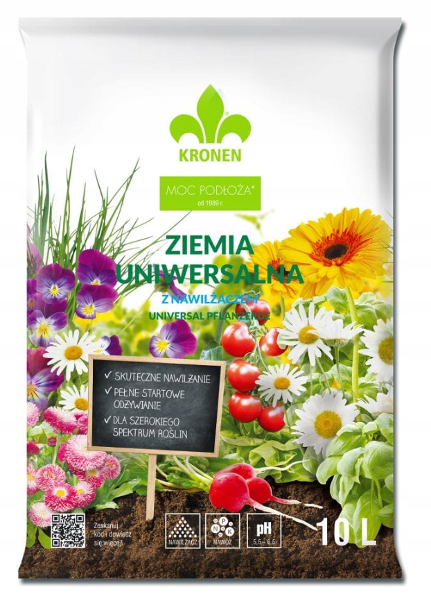 KRONEN® Ziemia uniwersalna z nawilżaczem jest przeznaczona do sadzenia i przesadzania wielu gatunków roślin zielonych i kwitnących, warzyw, ziół, bylin, iglaków w domach na balkonach, tarasach i w ogrodach, z wyjątkiem roślin kwaśnolubnych. Ziemia uniwersalna to wysokowartościowe, naturalne podłoże wyprodukowane na bazie torfu wysokiego o różnym stopniu rozkładu w oparciu o recepturę i doświadczenie profesjonalnych ogrodników. Ziemia uniwersalna zawiera nawilżacz i nawóz wieloskładnikowy z mikroelementami. Pojemność: 10 LITRÓW ZALETY DLA ROŚLIN: