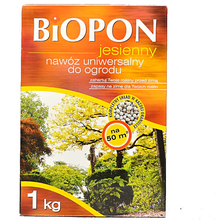 Jesienny nawóz uniwersalny Biopon do nawożenia doglebowego jest wieloskładnikowym granulatem o jednolitej konsystencji (kompletny skład w każdej granulce). Obniżona zawartość azotu hamuje przyrost roślin, a duża porcja potasu zwiększa odporność na wymarzanie. Nawóz długotrwale uzupełnia niedobory minerałów w glebie i tworzy zapasy składników odżywczych potrzebnych do rozpoczęcia wegetacji w następnym sezonie.