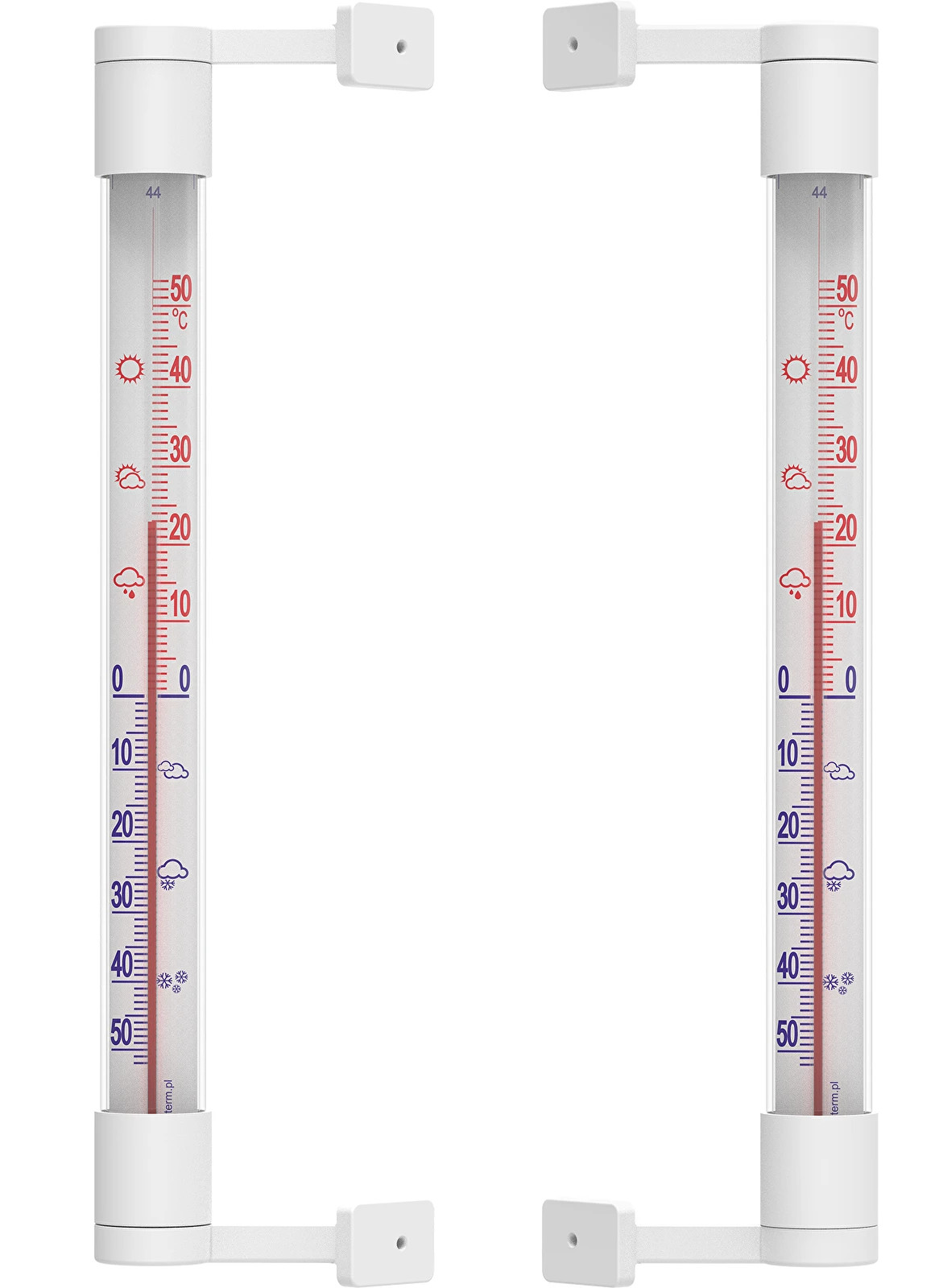 Termometr zewnętrzny montowany za pomocą załączonej końcówki z taśmą klejącą umożliwiającą przymocowanie termometru. Montowany do opraw wykonanych z tworzyw sztucznych, drewnianych oraz aluminiowych. Przedmiot posiada również otwór umożliwiający przykręcenie termometru. Parametry techniczne: